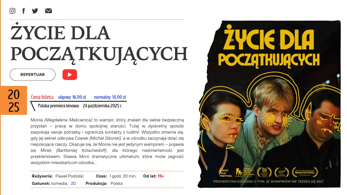 Życie dla początkujących Opublikowano 2025-10-01 przez Ewelina Kiedy gramy: 24 października 2025 r.godz. 20:00 25 października 2025 r.godz. 20:00 26 października 2025 r.godz. 20:00 29 października 2025 r.godz. 20:00